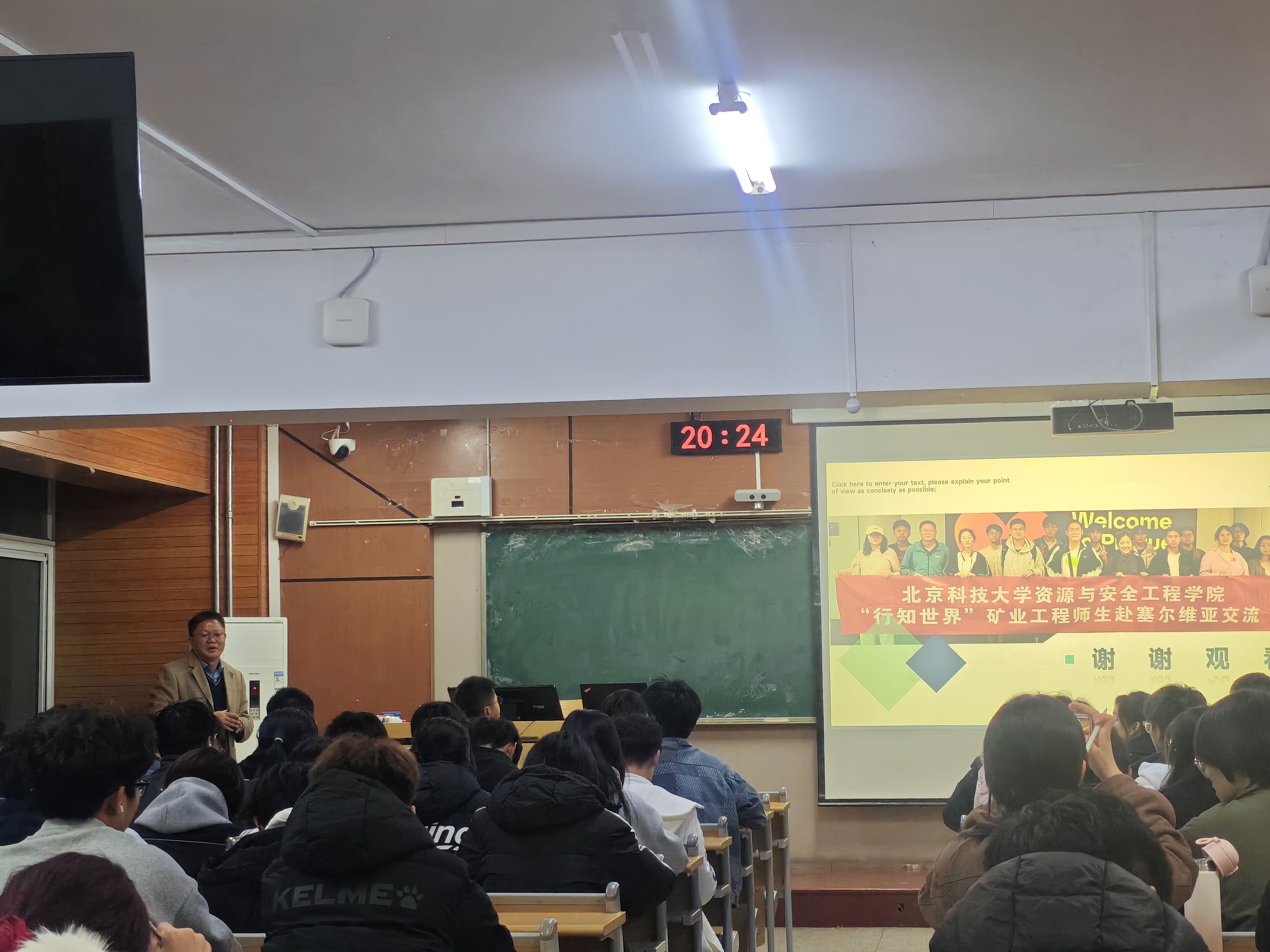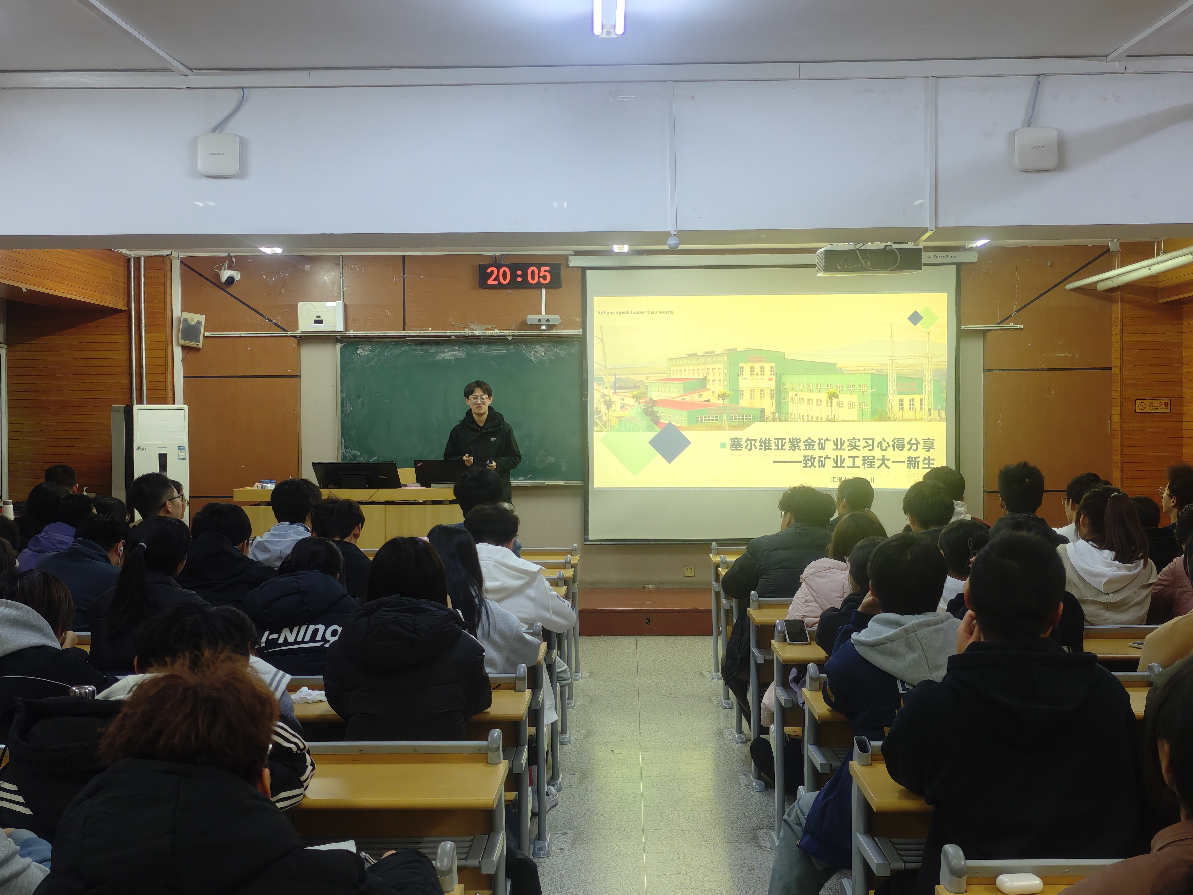 矿加242班沈小川以“行知世界-矿业工程学生赴塞尔维亚紫金矿业实习心得分享”为主题,从当地矿山工艺、人文风情讲到特色美食,以轻松幽默的语言描述了在异国实习的点点滴滴,他重点介绍了紫金矿业公司赴国外矿山工作员工的生活条件、休假制度、工资待遇和公司人文关怀等内容,极大激发了同学们对国际交流和毕业后赴国外矿山工作的热情。